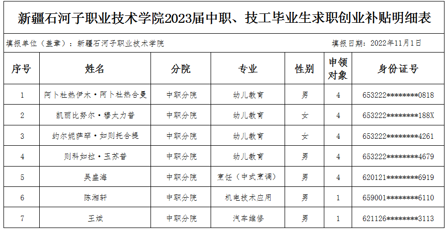 经中职分院评审小组会议通过,现对中职分院2023届中职、技工毕业生求职创业补贴名单进行公示,公示日期为:2022年11月2日至2022年11月4日。
