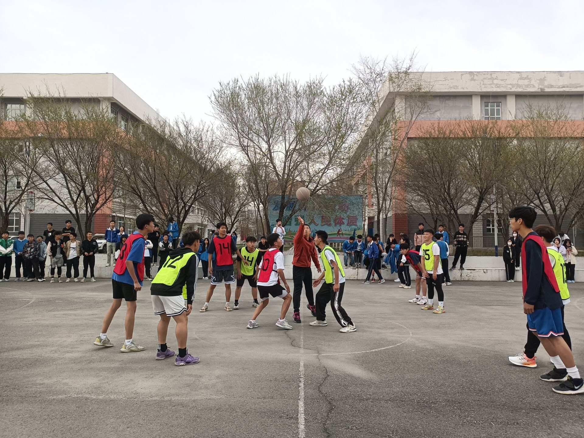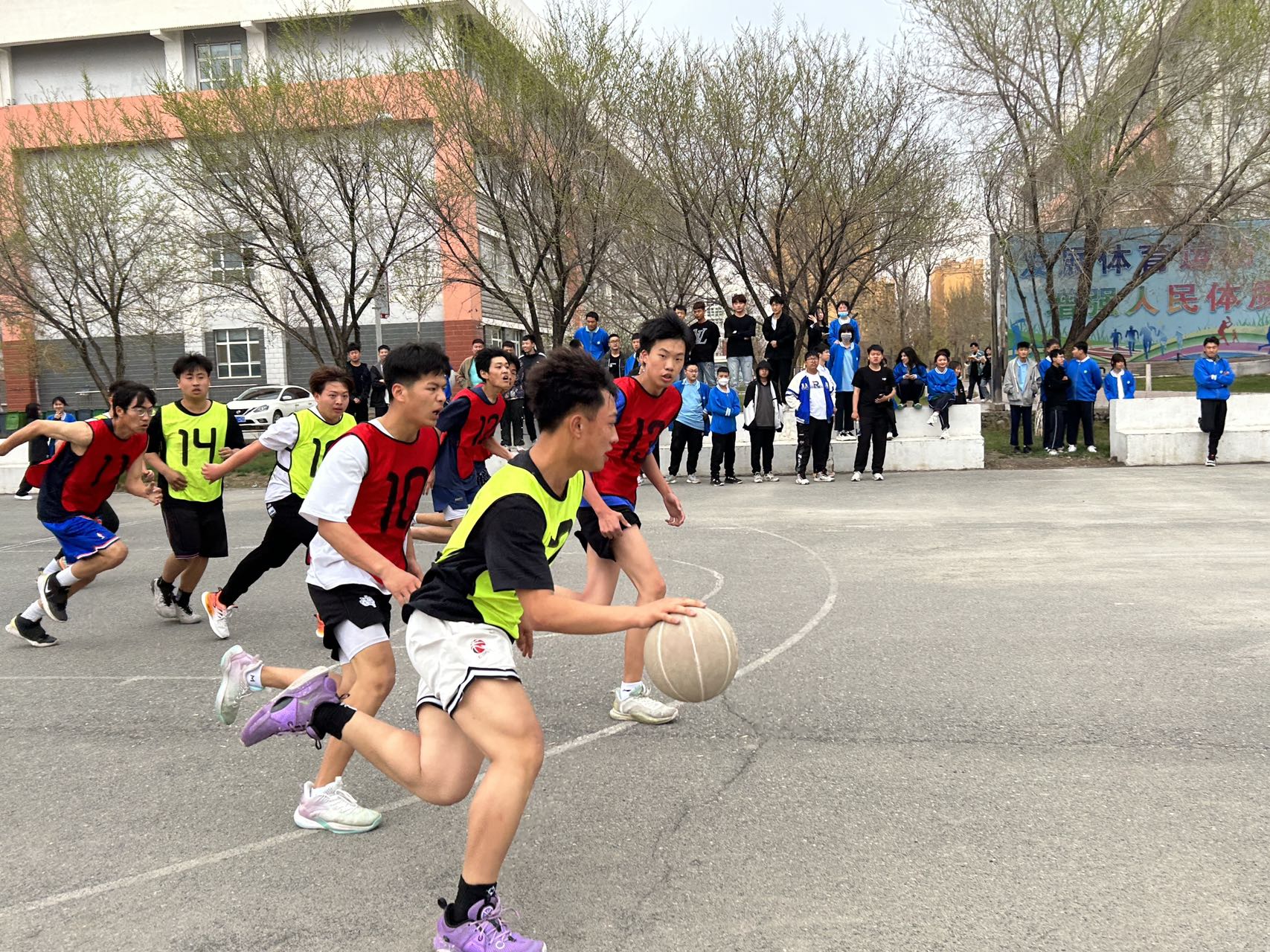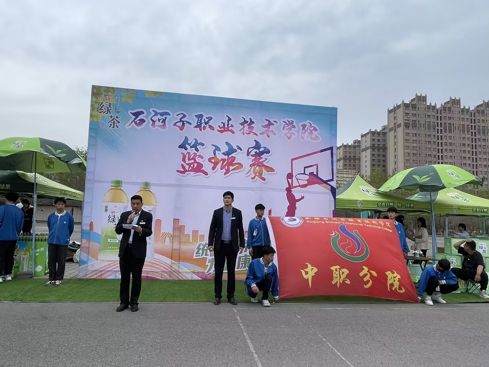 (学办供稿)为展现中职分院学生的青春活力、积极向上的精神风貌,提高学生共同竞争和相互合作的团队精神。中职分院于4月17日下午在篮球场举行了“志存高远,携手奋进,用青春托起中国梦”主题篮球比赛开幕式活动。副院长马木提、学生管理办公室主任杨凯、书记院长助理丁雷、体育组主任顾亚平出席了此次开幕式。